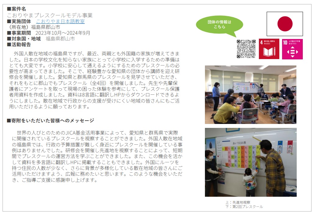2026年4月4日 / 最終更新日 : 2026年4月4日 admin メディア掲載 世界の人びとのためのJICA基金 ニュースレター2025 前期 世界の人びとのためのJICA基金 ニュースレター 2025 前期 8ページ 案件名 こおりやまプレスクールモデル事業が掲載されました。 https://www.jica.go.jp/activities/schemes/partner/private/kifu/__icsFiles/afieldfile/2025/06/24/Newsletter2025-1_4.pdf